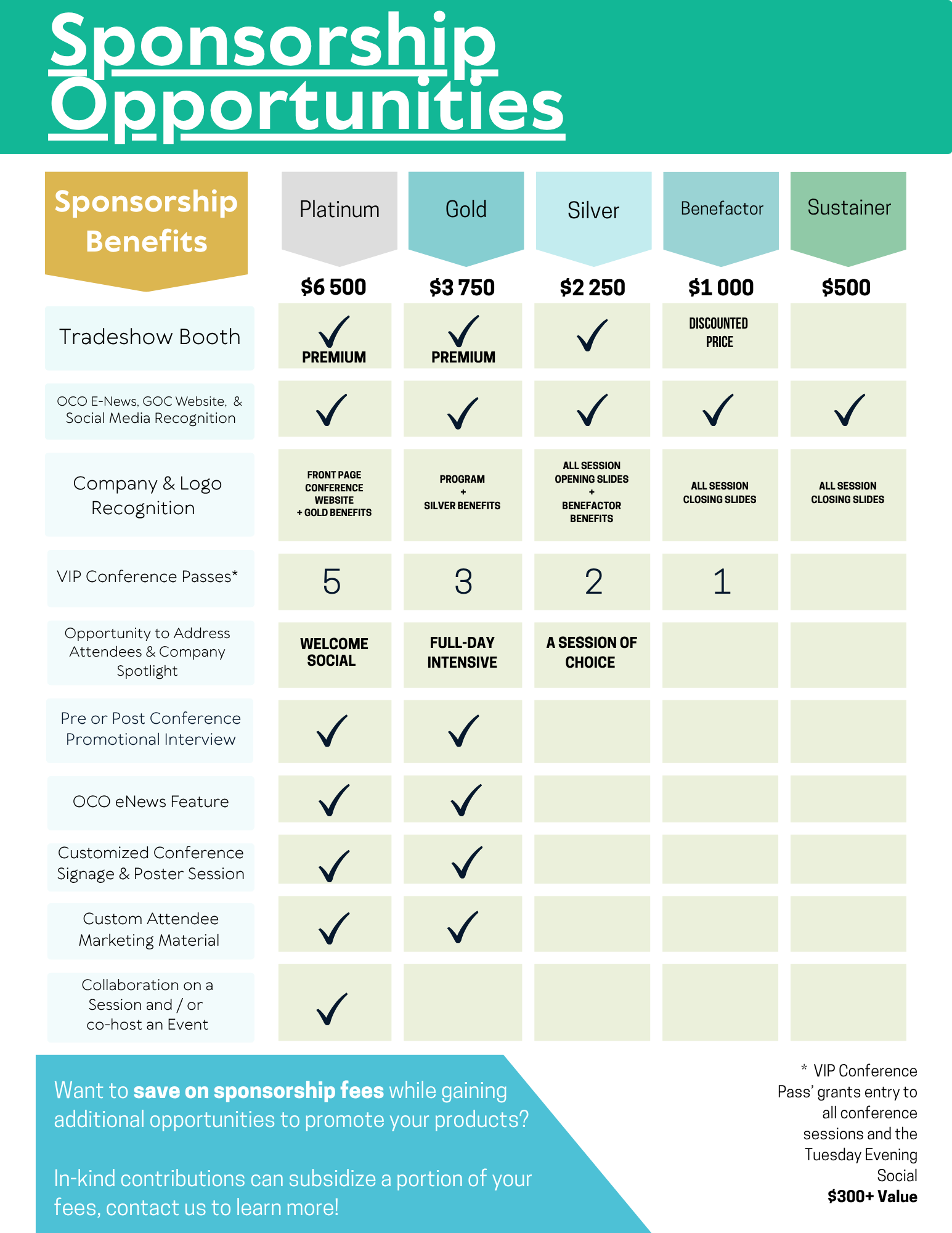 All sponsors receive recognition on the GOC website, OCO eNews, and social media channels.